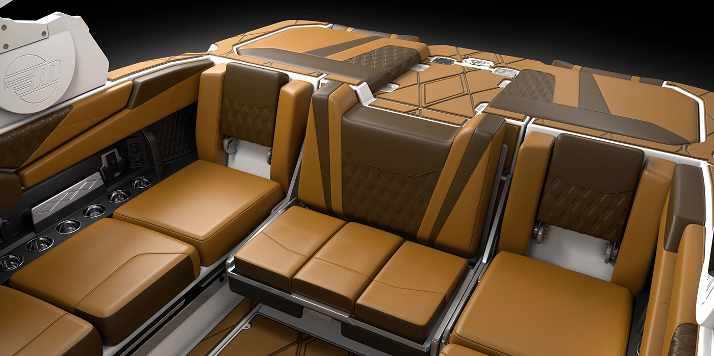 2025年から新製品として、M230とM242でのみ利用可能なヘルムシートファイバーグラスインサートパネルが登場。メタリックおよび非メタリックのゲルコートオプションから選択して、ボートのインテリアをカスタマイズし、水上でワンランク上の存在感を出す事が出来ます。
